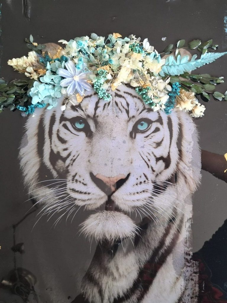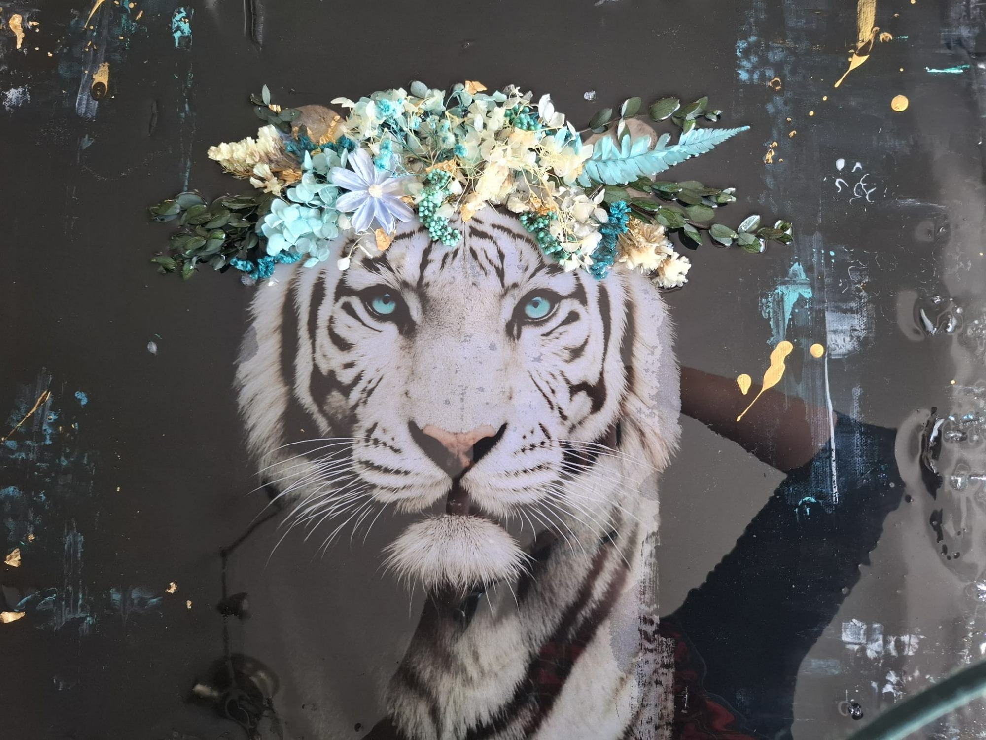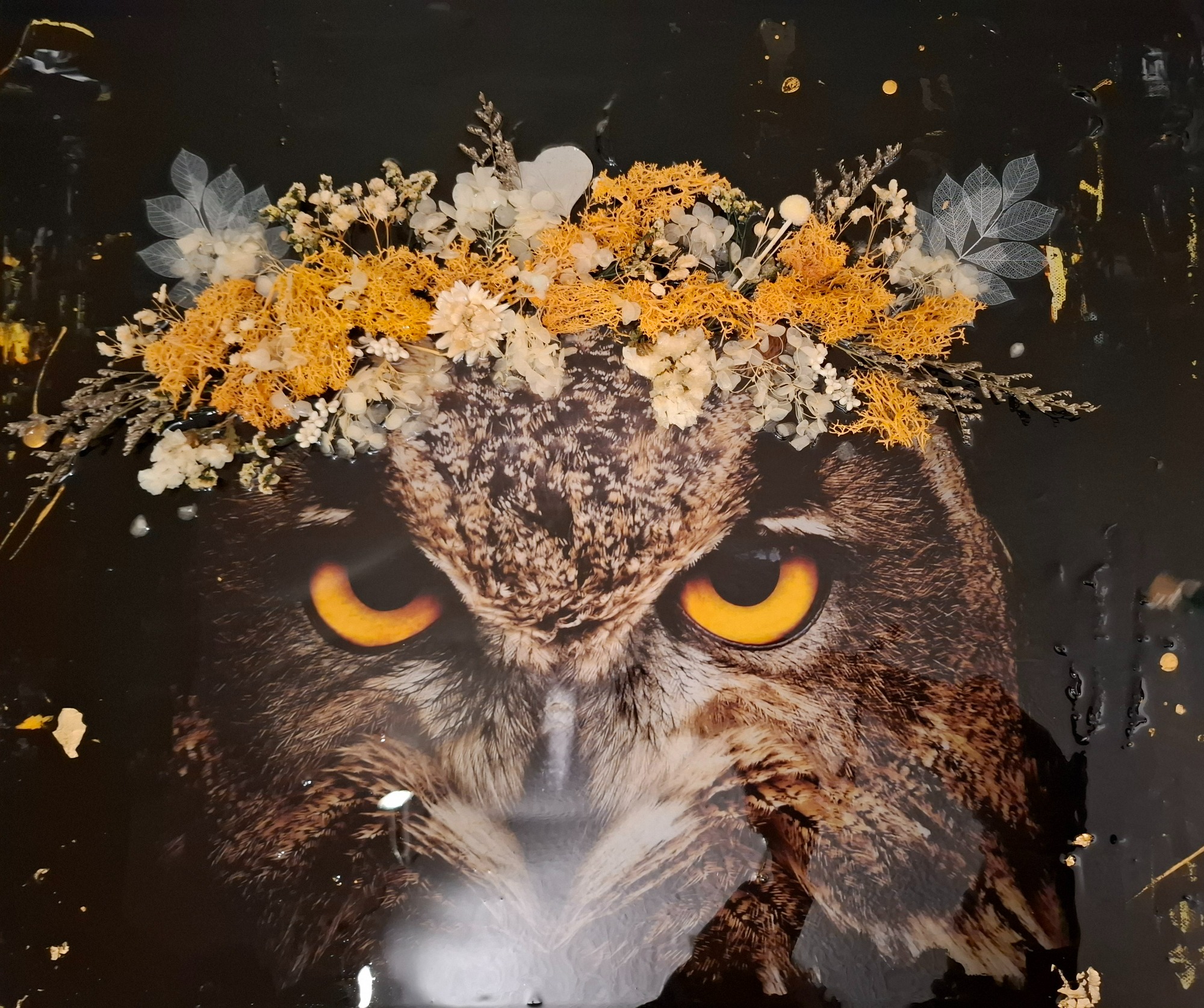 Acrylmalerei trifft auf echte, getrocknete Naturblumen, die in Epoxidharz eingebettet werden. So entsteht eine besondere Tiefe und eine edle, glänzende Oberfläche mit intensiver Farbwirkung.